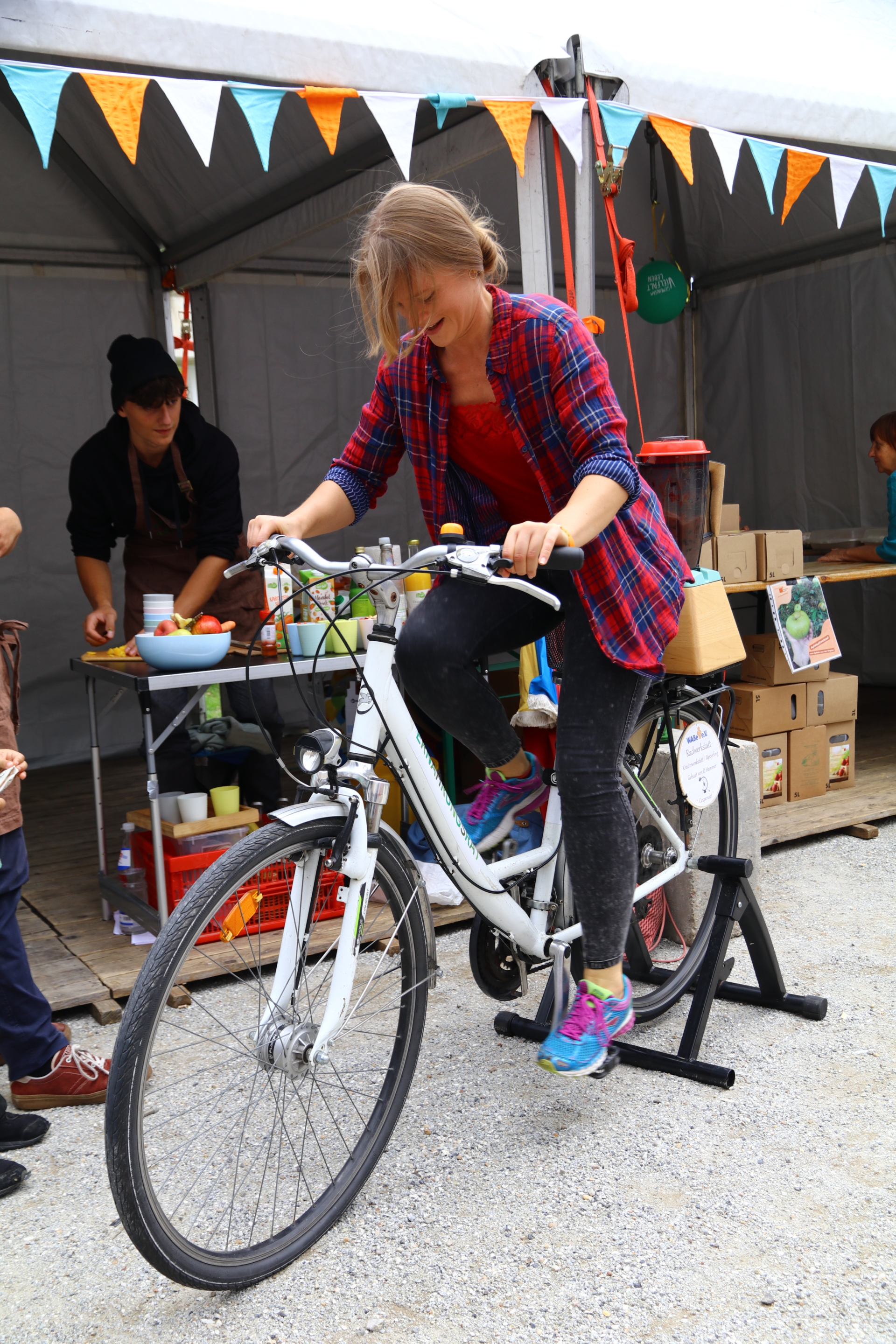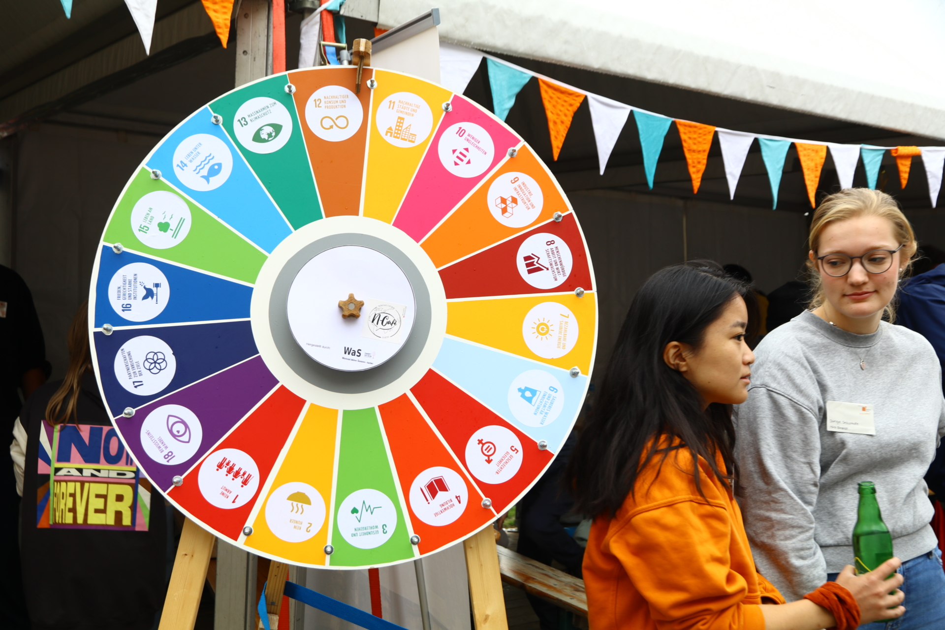 Das Glücksrad zu den Nachhaltigkeitsziele drehte sich, es wurde kräftig in die Pedale des Smoothie-Bikes getreten, bunte Luftballons und geschminkte Kindergesichter waren auf dem „Platz für Demokratie“ zu sehen. Anfangs schien sogar die Sonne!