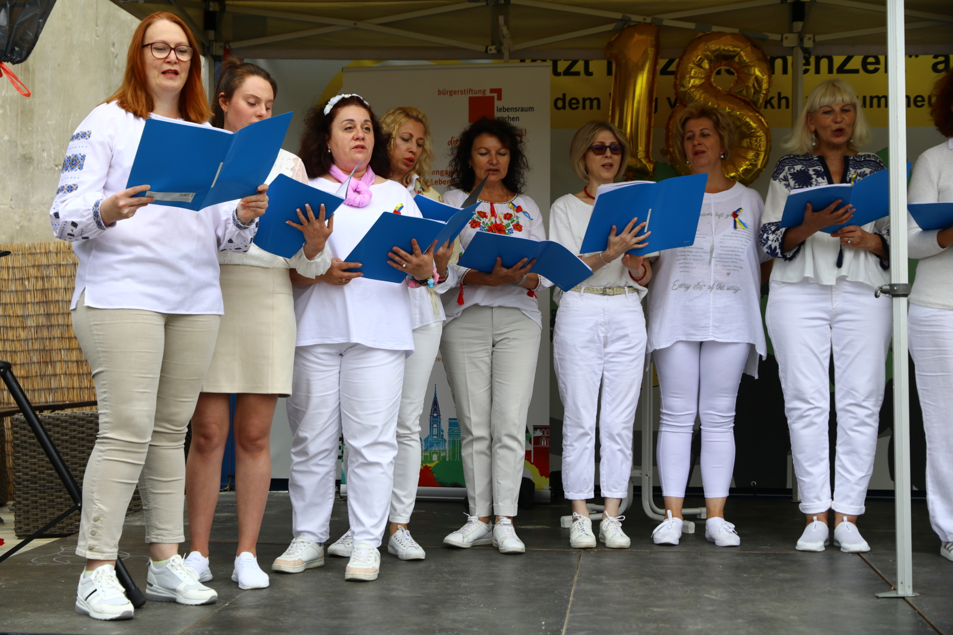 Nach einem musikalischen Impuls des ukrainischen Chors „Paragraf 24“ unter der Leitung von Oksana Bogdan, hieß Ursula Tiebel im Namen des Vorstands die Gäste, Ehrenamtlichen und Stifter:innen herzlich willkommen. Hilde Scheidt gratulierte der Bürgerstiftung im Namen der Oberbürgermeisterin Sibylle Keupen herzlich zum Geburstag und auch die Improvisationstheatergruppe „Fliegender Wechsel“ stimmte die Gäste mit „Happy Birthday to you…“ein.