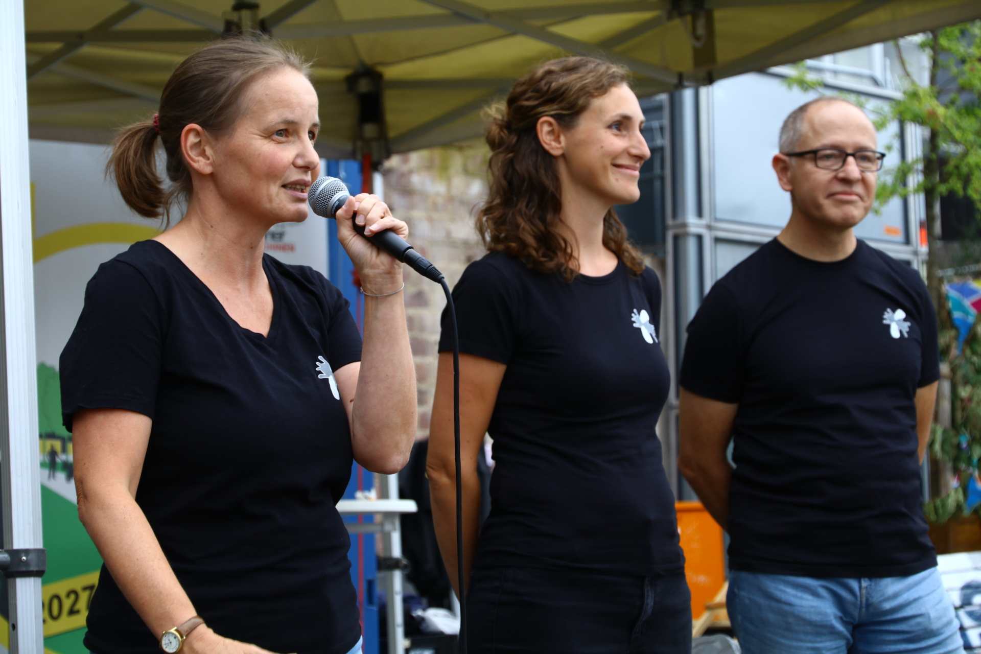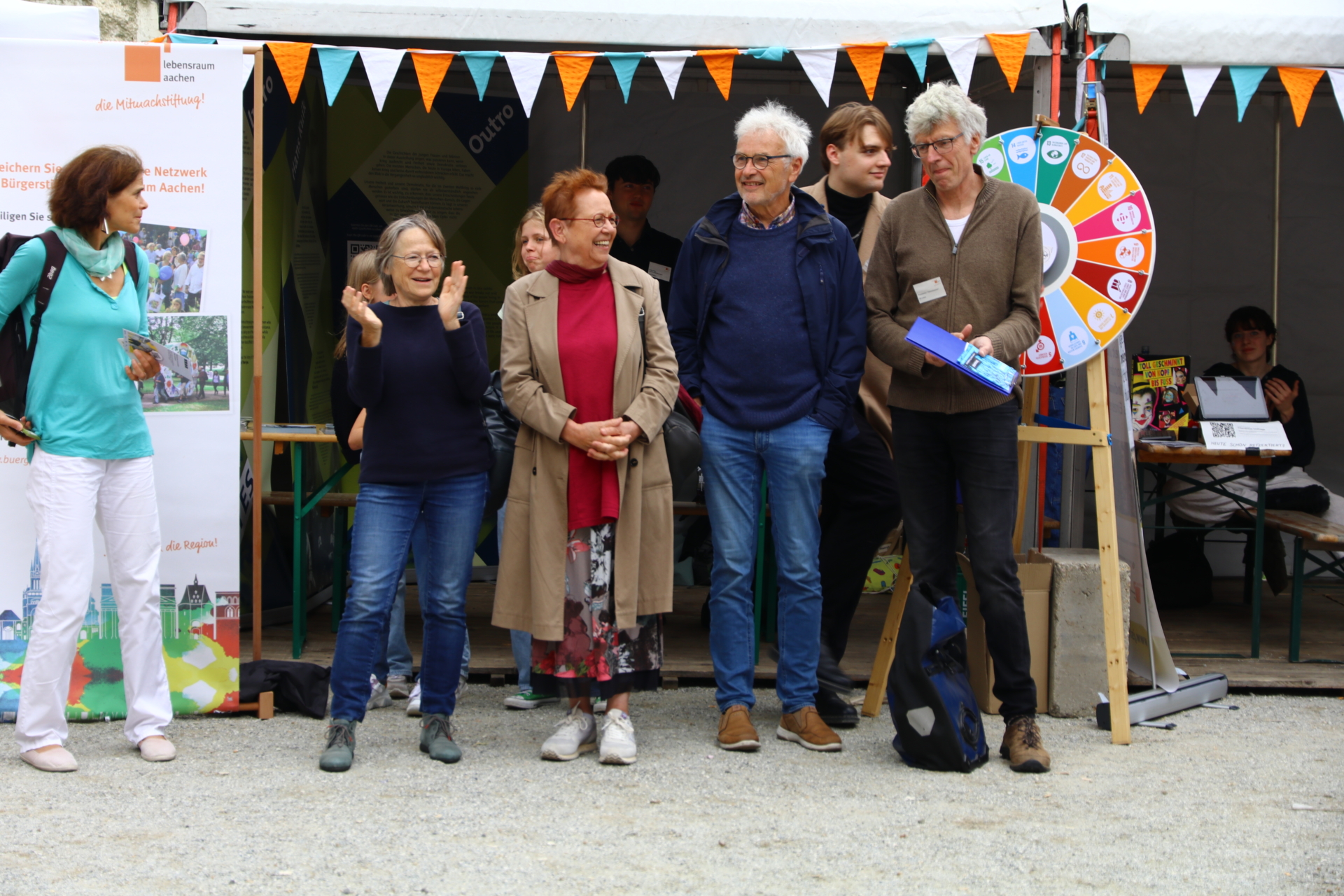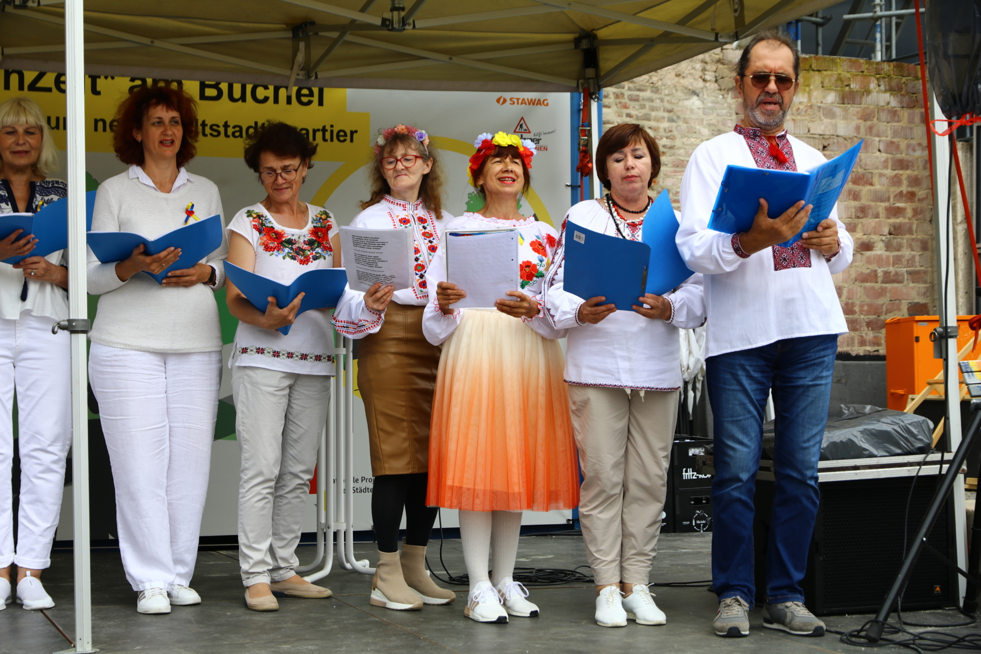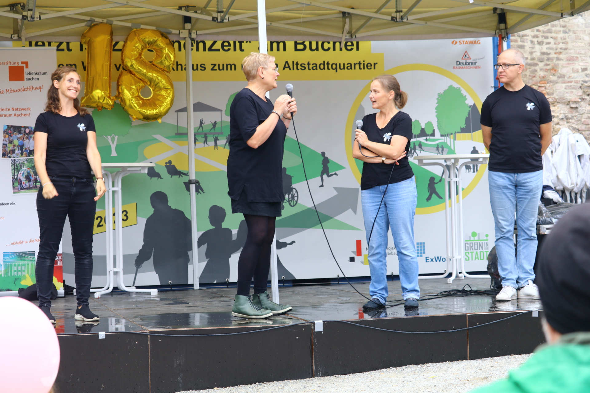 In einem kurzweiligen Podiumsgespräch kamen Ehrenamtliche und Gründungsstifter:innen der Bürgerstiftung zu Wort. Als ein Regenschauer auf den Platz niederprasselte, spannten sich viele bunte Regenschirme auf – der fröhlichen Stimmung tat dies keinen Abbruch. Ukrainische Lieder und interaktives Improvisationstheater sorgten für gute Unterhaltung.