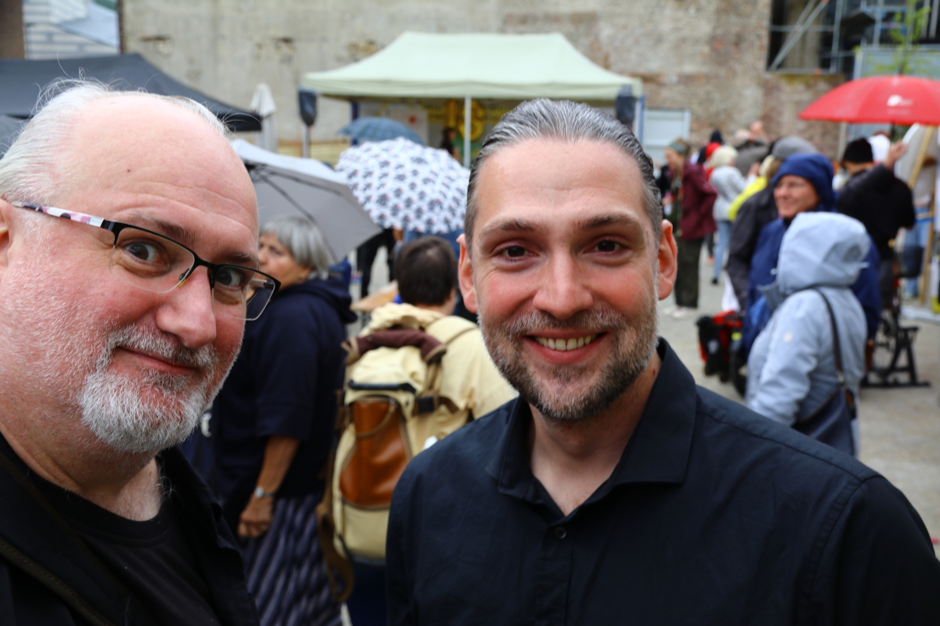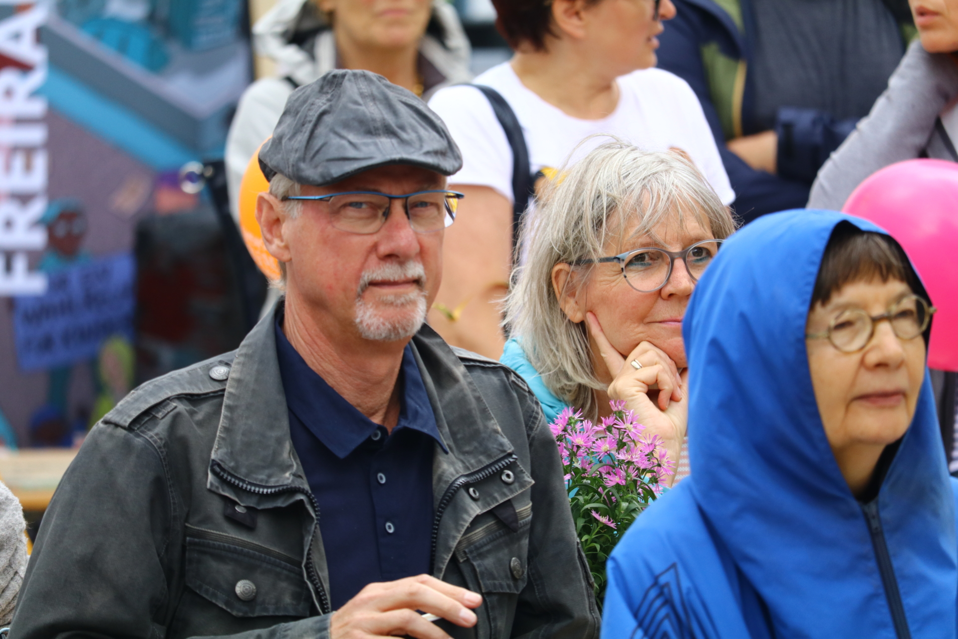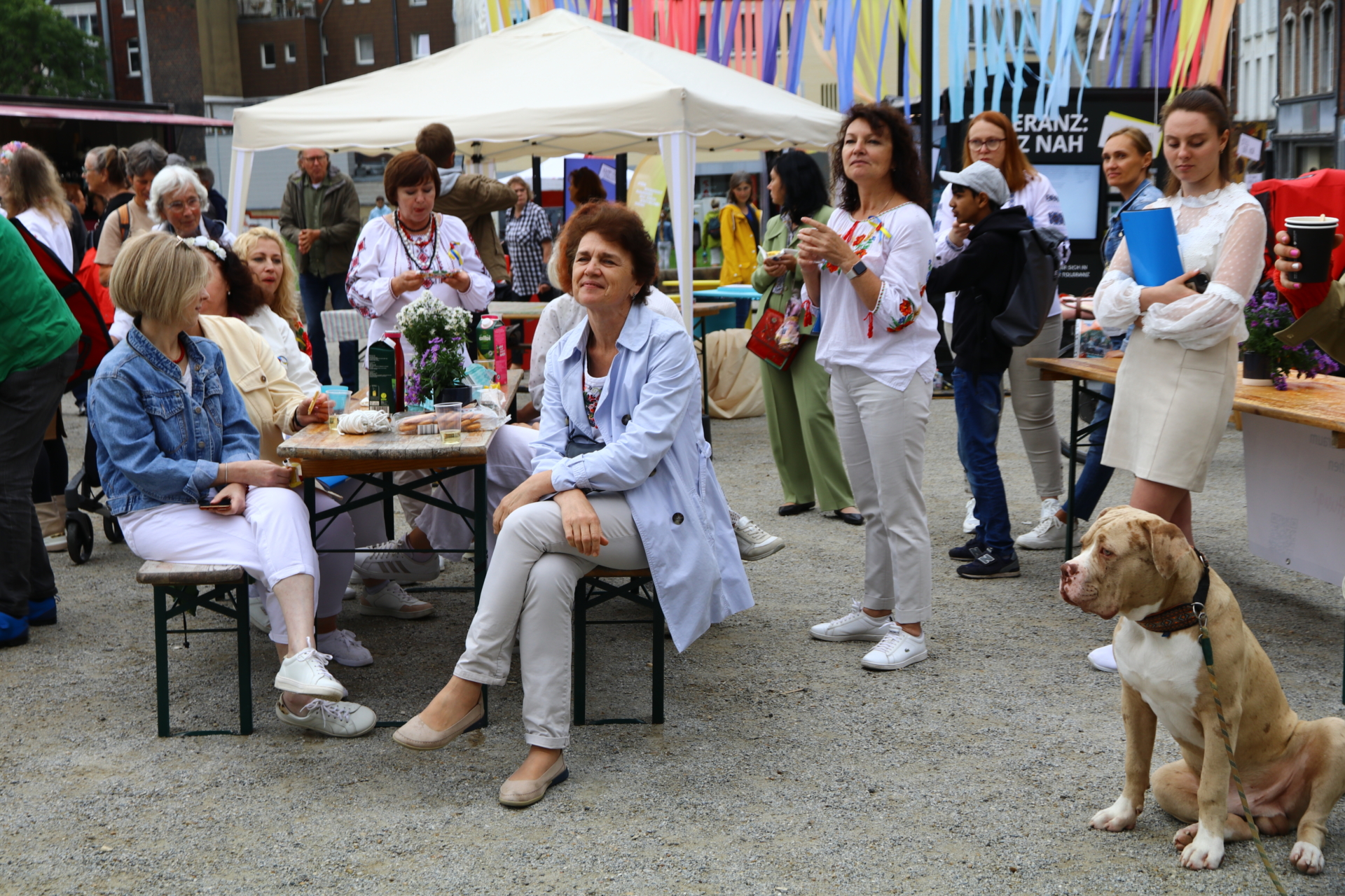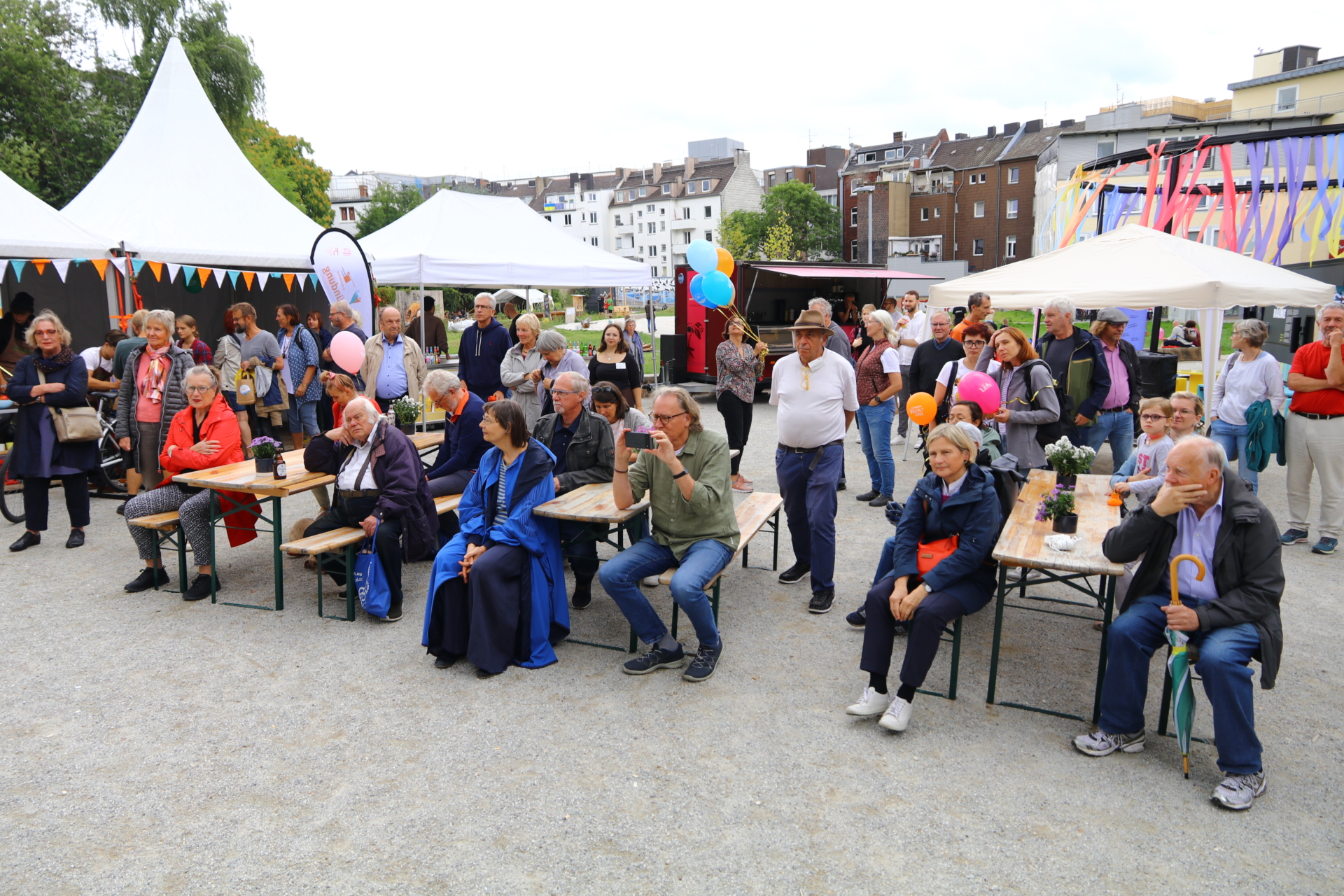 In einem kurzweiligen Podiumsgespräch kamen Ehrenamtliche und Gründungsstifter:innen der Bürgerstiftung zu Wort. Als ein Regenschauer auf den Platz niederprasselte, spannten sich viele bunte Regenschirme auf – der fröhlichen Stimmung tat dies keinen Abbruch. Ukrainische Lieder und interaktives Improvisationstheater sorgten für gute Unterhaltung.