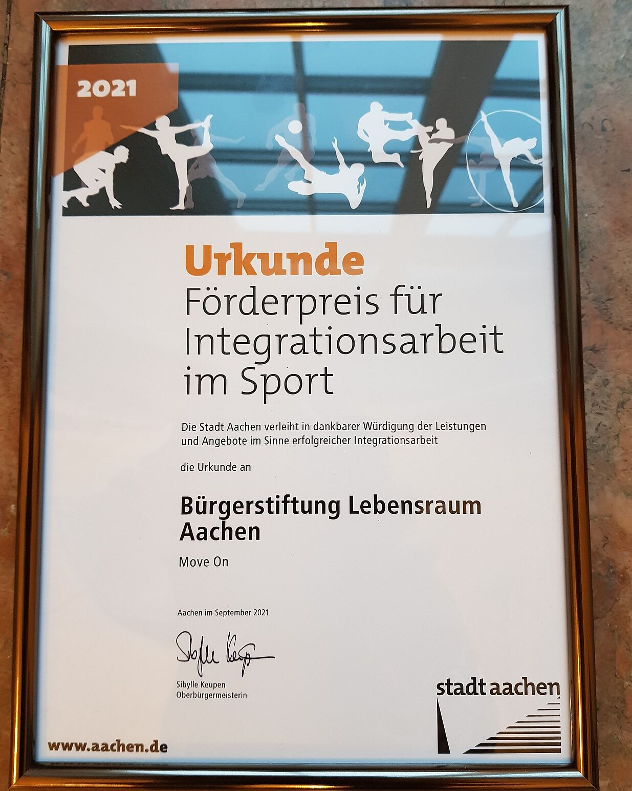 Die Bürgerstiftung Lebensraum Aachen ist alleiniger Träger des Projektes. Eine enge Kooperation besteht mit „Die Halle“, einer Boulder- und Freizeithalle in Aachen. Die Lebenshilfe Aachen ist bei „Move On“ mitwirkend sowie die Schule für Physiotherapie der Uniklinik Aachen. Darüber hinaus erhält das Projekt Zuspruch des Universitätsklinikum Aachen. Auch die Stadt Aachen und der Stadtsportbund Aachen befürworten das Jugendsportprojekt. Dank einer Anschubfinanzierung von „Aktion Mensch“ konnte das Projekt in die Wege geleitet werden. Die Postcode Lotterie förderte die Weiterentwicklung des Projekts, welches Ende 2025 abgeschlossen wurde.